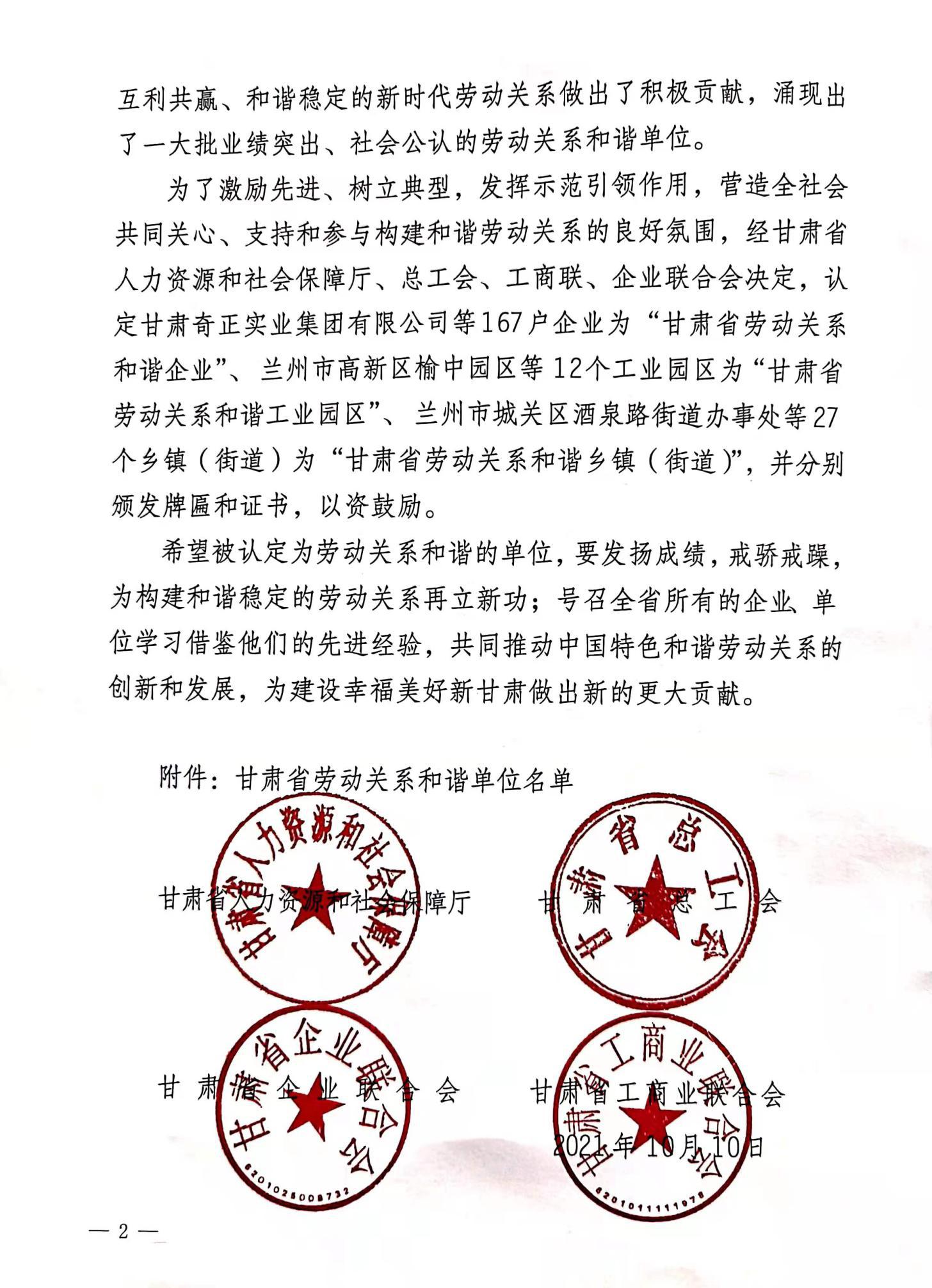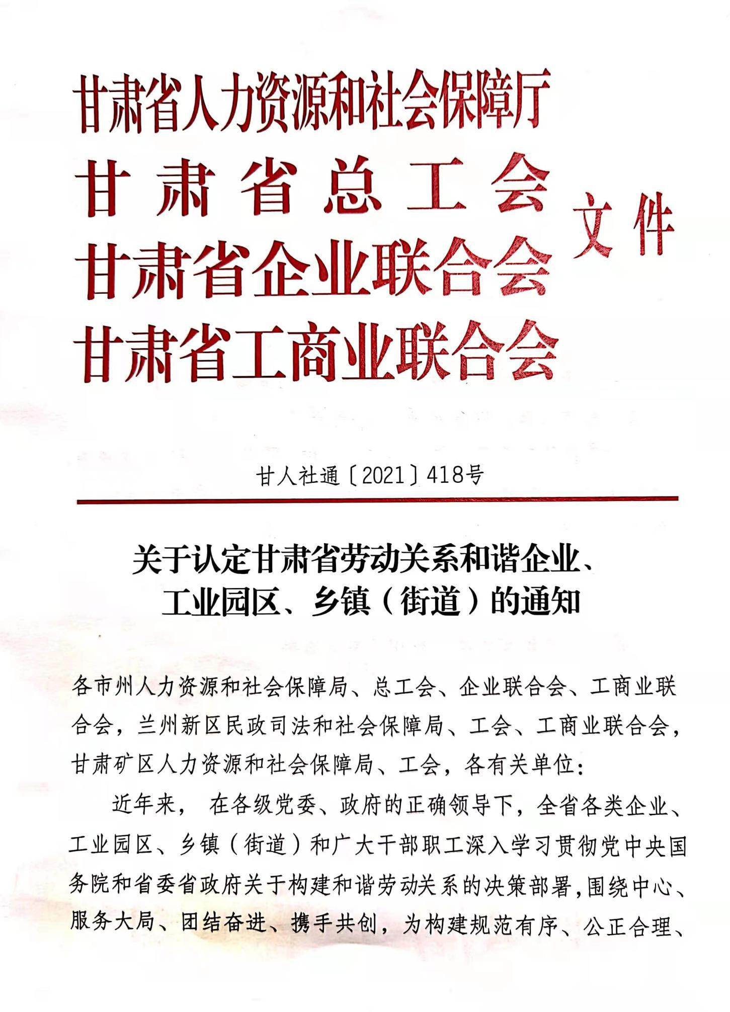 構建和諧穩定的勞動關系,是貫徹習近平新時代中國特色社會主義思想,加強和創新企業管理、促進企業發展、保障職工合法權益的重要舉措。近年來,公司工會立足“發展企業、富裕職工”基本宗旨,全面加強和諧勞動關系建設,不斷提高服務職工水平。公司工會充分利用職工代表大會、會員代表大會、廠務公開平臺載體,匯集職工智慧,凝聚發展合力;嚴格落實困難職工、生病生育職工、長期異地工作職工幫扶慰問,增強企業發展向心力;組織開展文體競賽、培訓學習等職工活動,繁榮企業文化建設...從多維度不斷滿足職工群眾的新期待、新需求,加快構建規范有序、公正合理、互利互贏、和諧穩定的新時代和諧勞動關系,為推動公司高質量發展作出了積極貢獻。獲得“甘肅省勞動關系和諧企業”這一省級榮譽,也是對公司多年來構建和諧勞動關系工作成績的充分肯定。
