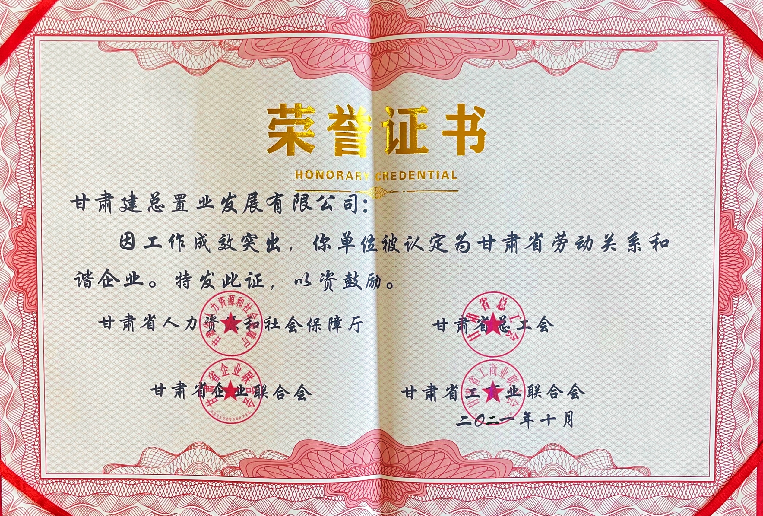 近日,甘肅建總置業發展有限公司被授予“甘肅省勞動關系和諧企業”榮譽稱號。該項榮譽由公司工會、公司人力資源部聯合申報,甘肅省人力資源和社會保障廳、甘肅省總工會、甘肅省企業聯合會、甘肅省工商業聯合會共同評審頒發,本次共認定省內等167戶企業為“甘肅省勞動關系和諧企業”。