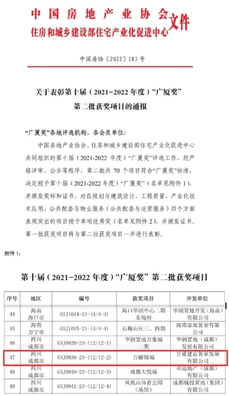 近日,由甘肅建總置業發展有限公司成都公司開發建設的百酈錦城項目榮獲中國房地產業最高榮譽“廣廈獎”。