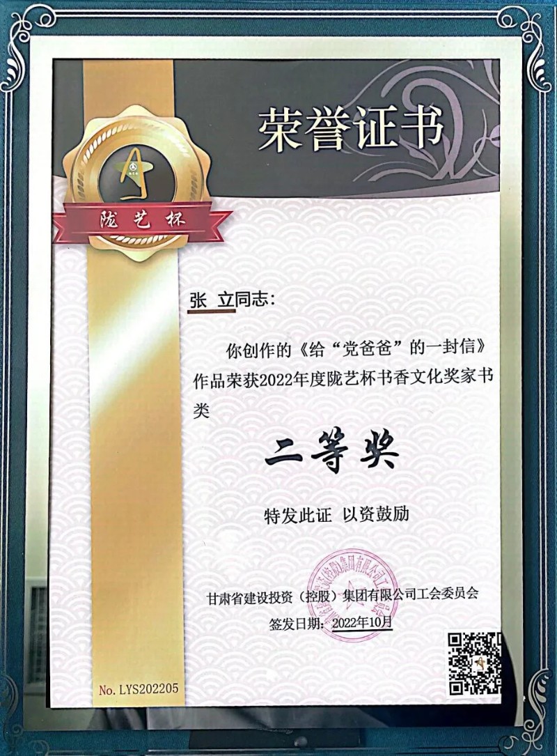 2022年,集團公司工會以“書香滿庭芳 奮斗新征程”為主題,組織開展了“隴藝杯”書香文化活動,經集團公司組織評審,置業公司天水分公司職工張立的作品《給“黨爸爸”的一封信》榮獲家書類作品二等獎。