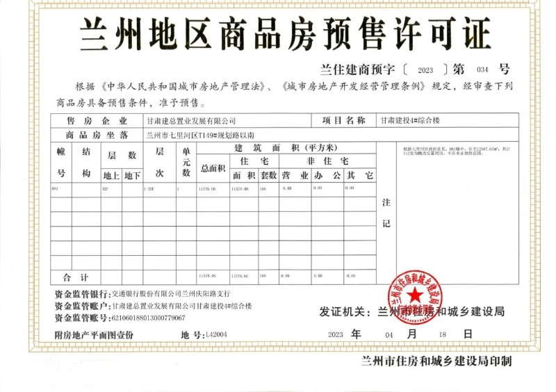 4月19日,甘肅建投4#綜合樓項目不負眾望順利取得《預售許可證》,標志著4#樓項目正式準入市場預售。