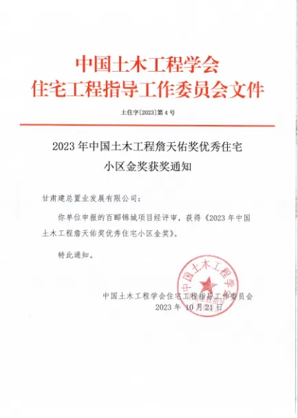 “詹天佑獎優秀住宅小區金獎”是百酈錦城項目繼2022年榮獲地產行業最高榮譽“廣廈獎”之后又一國家級重要獎項,是甘肅建投首個同時獲得“廣廈獎”和“詹天佑獎優秀住宅小區金獎”的項目,充分體現了業界對甘肅建投地產質量、品質及科技創新的肯定。