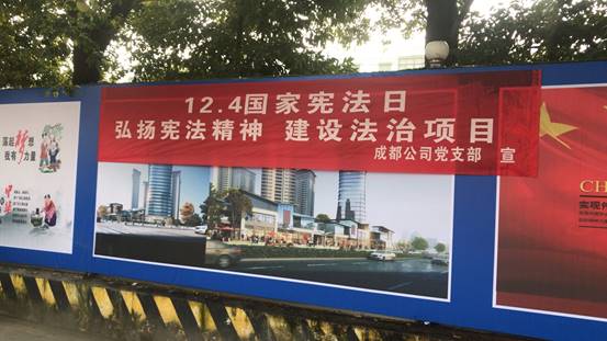 12月1日至7日,是我國的第六個“憲法宣傳周”。為廣泛開展憲法學習宣傳教育,大力弘揚憲法精神,維護憲法權威,更好地發揮憲法在項目建設中的重大作用。成都公司黨支部開展了形式多樣的憲法宣傳周活動,通過在項目辦公室、建筑工地懸掛宣傳橫幅、LED顯示屏播放《憲法》知識、組織員工專題學習等方式,讓憲法深入人心,在項目上生根發芽。