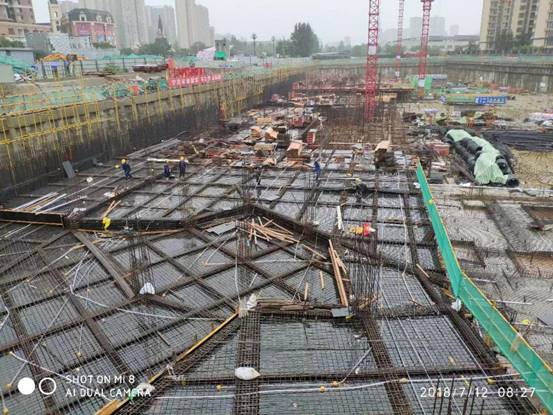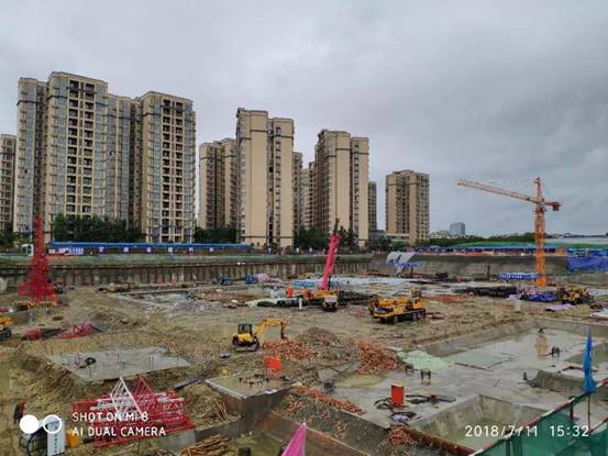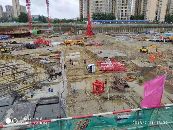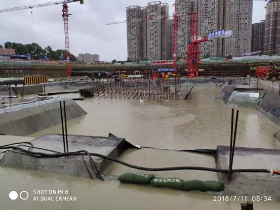 2018年7月,成都遭遇57年來最大降雨,多地出現暴雨橙色預警,四川省啟動II級防汛應急響應。為切實做好防暴雨安全措施,嚴防工地洪澇事故發生,百酈錦城的青年們組織各方,齊心協力、緊密協作,積極開展防汛抗災工作。迅速成立防汛工作領導小組,提前安排部署,啟動防汛搶險應急預案。各單位負責人親赴防汛一線,實地巡查,及時了解汛情。在施工現場張貼防汛標語、設置警戒線,加強防汛沙袋、水泵、汽油等防汛物資的儲備,打好防汛前戰。實行24小時值班制度,專人守護、實時監控,密切監視汛情,加強汛情信息分析預測、預報、預警,加大對基坑四周的巡查力度,密切關注基坑沉降情況,針對基坑積水、土釘墻漏水等問題,使用挖機挖掘溝道、集水坑,利用水泵抽水至市政管道排走,保障基坑周邊的降水井正常降水。此外,為防止市政停電,現場配備柴油發電機,保證在停電后一個小時內,迅速恢復降水。同時加強臨電管控,有雨時除降水井用電外,其余配電箱全部停電。停雨后,分級檢查各設備情況,確認無隱患后,逐級送電。合理分配救災力量,搶險救災有條不紊進行,確保百酈錦城項目安然無恙。