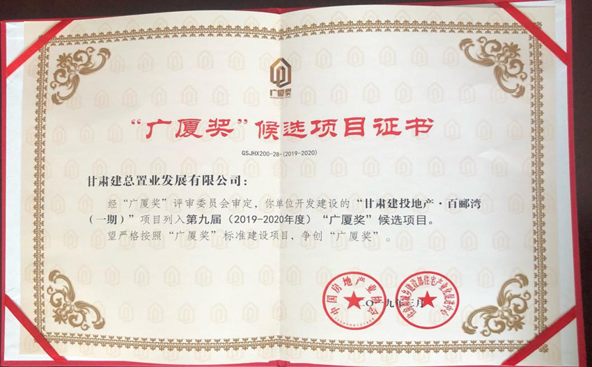 此次入選,彰顯了“甘肅建投地產•百酈灣”項目的不凡品質。置業公司百酈灣項目將不忘初心,堅持“品質鑄就未來”的理念建設更優精品項目,打適老百姓滿意的好房子及人居環境,爭創廣廈獎,為城市經濟建設做出更大的貢獻。